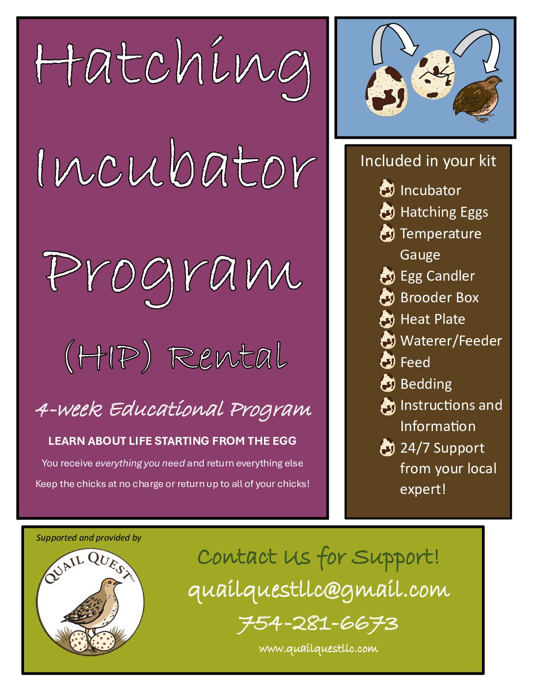 The Hatching Incubator Program (HIP) is a 4 week educational course with hands-on learning of the life cycle of quail. This is an all-inclusive kit designed for people that are looking to hatch their own covey without paying the top dollar. Each kit includes the incubator, brooding kit, informational booklet/guides specifically designed by Quail Quest LLC, and every essential item needed for raising the quails up to 2 weeks old. Customers can keep the chicks or return up to all of them for no additional charge. More information can be found on the Hatching @ Home Tab on the website. Kits are released in a first-come-first-serve basis, so please notify us if you would like a specific date range so we can adjust the schedule to fit as close as possible to your desired dates. This kit cannot be shipped, but can be delivered or picked up at the farm. If you want to know the limits of our outreach, please send us an email at [email protected].